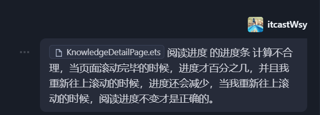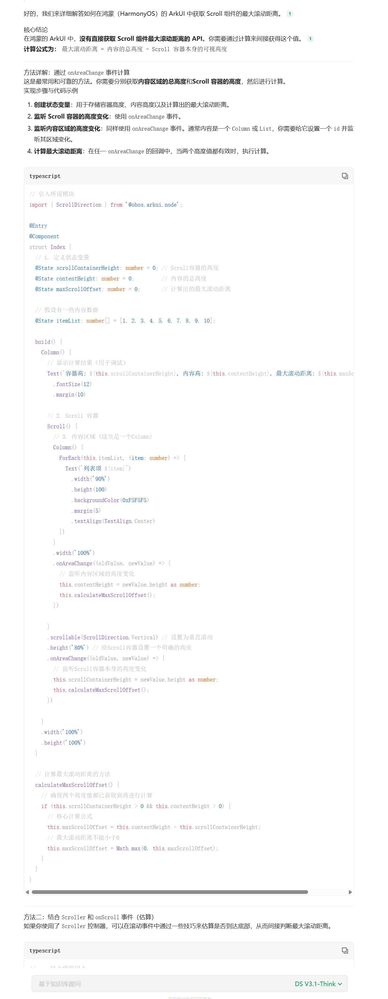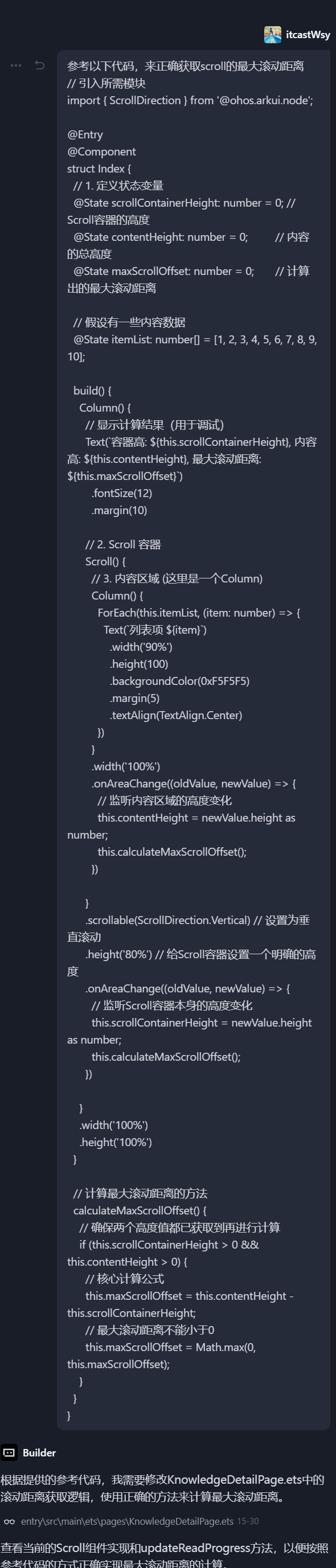阅读进度的百分比 = 当前页面滚动的距离  /  页面可以滚动最大的距离这部分代码在HarmonyOS中,结合AI工具实现的话, AI编辑工具死活不知道如何获取页面最大的距离,这个也怪它,要知道鸿蒙开发官网的文档都不是服务器渲染的,也就是你直接给ai一个网址,它是无法直接读出里面具体的代码的。