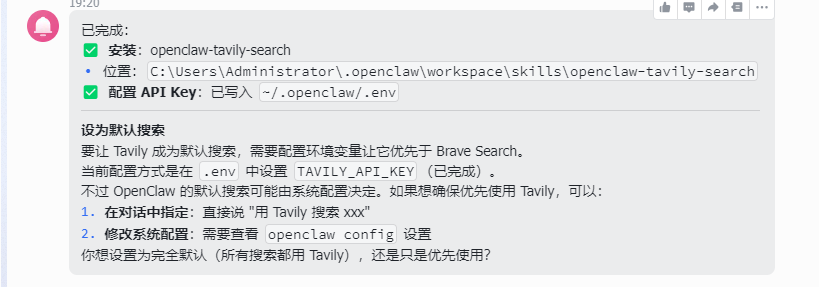 帮我安装 Tavily Web 这个技能,并且设置它为你默认的搜索技能,并且配置 Tavily Web 的 key: xxxxxxxxx