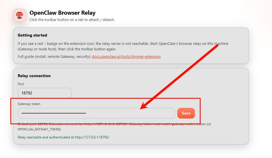 OpenClaw Browser Relay插件,粘贴进去你的 token配置