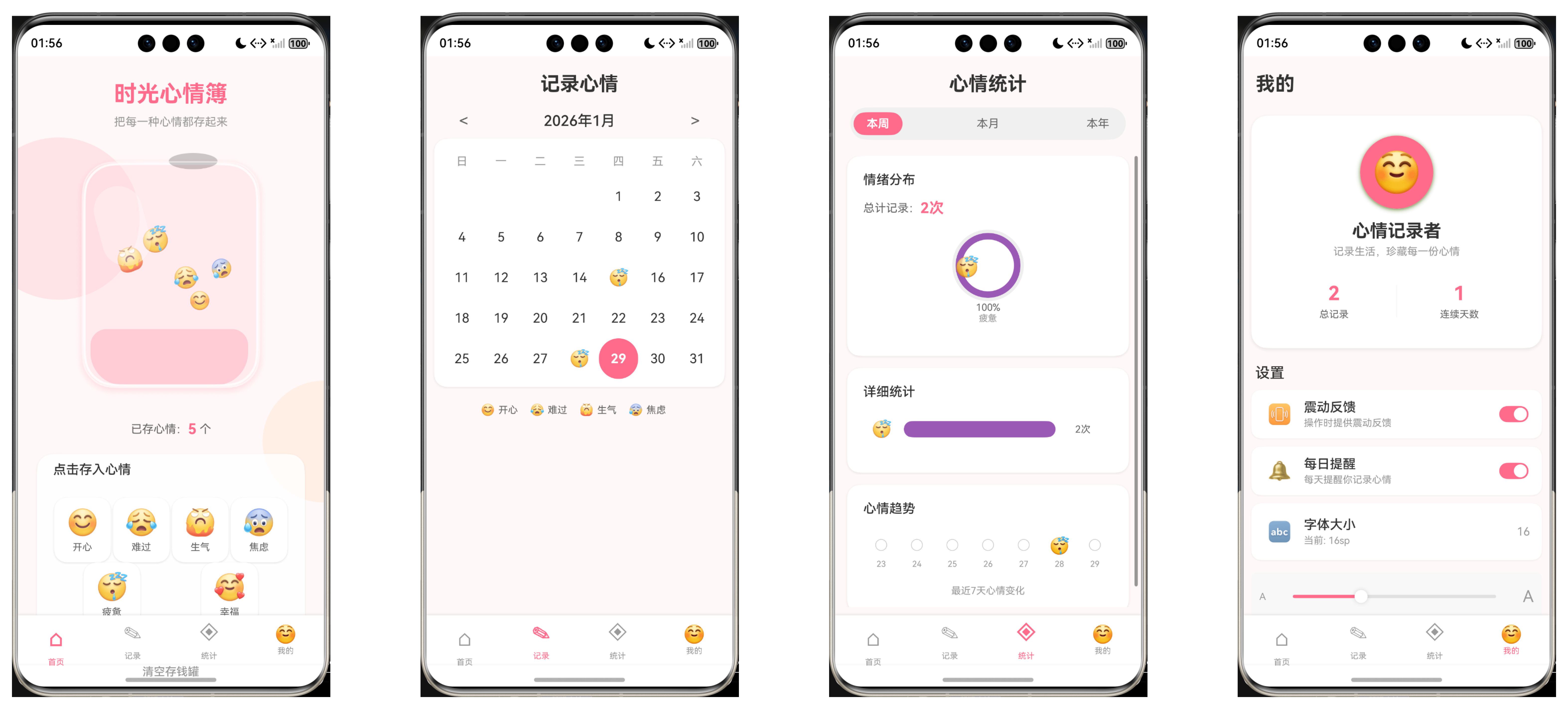1首屏上是 4个tab,分别是首页-记录-统计-我的 1 首页是一个透明有边框的存钱罐,点击不同的心情图标可以往存钱罐里面存图标,图标下落要有动画效果,存钱罐在瓶子里也有有真实的碰撞效果