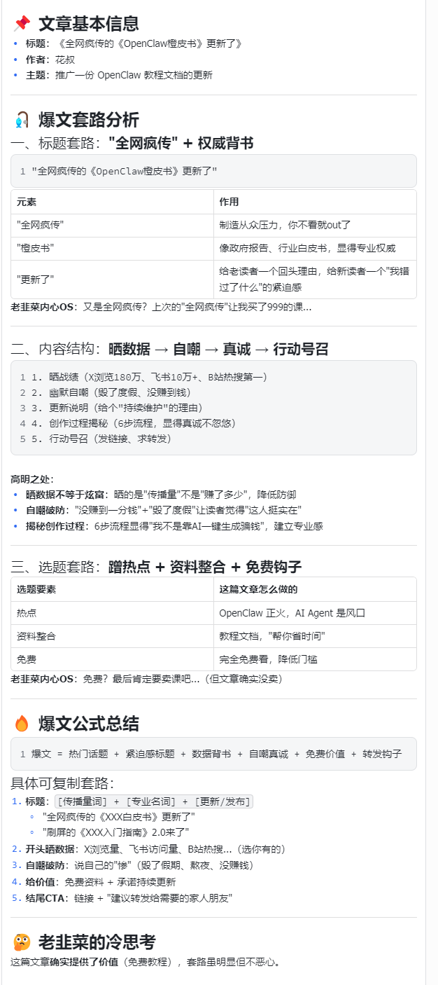 如果你也想写 OpenClaw 相关的文章,不妨参考一下花叔的“数据+自嘲”策略,或者坚持我的“干货+真诚”路线。 说不定你也可以参考这个思路,写出一个属于你的爆文分析 Agent!