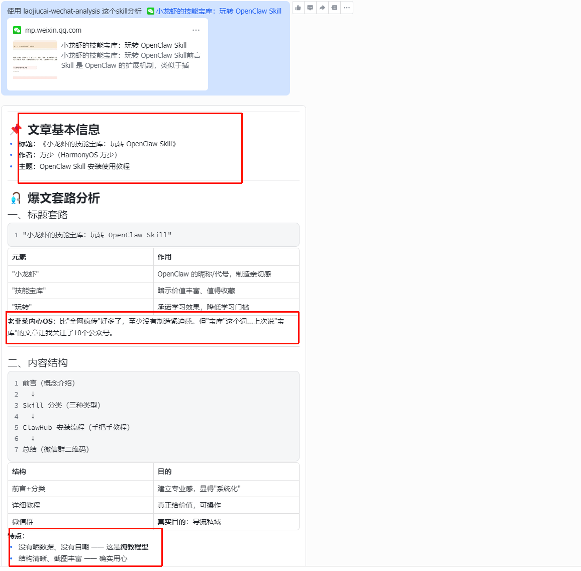 接着,我又用小龙虾分析了我自己写的文章《小龙虾的技能宝库:玩转 OpenClaw Skill》,看看和花叔的爆文比,差距在哪里。