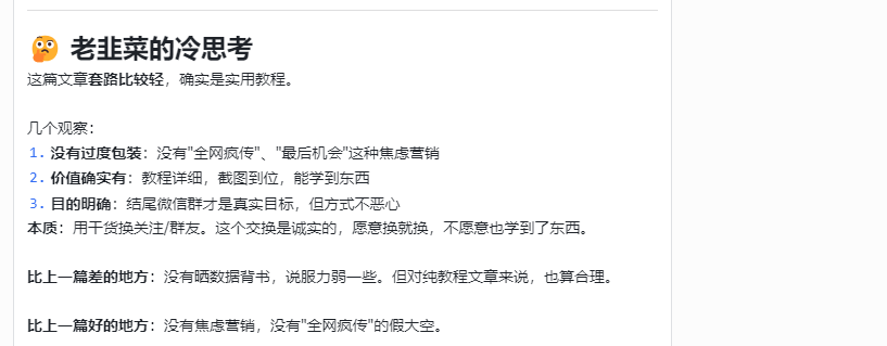 - 比上一篇差的地方:没有晒数据背书,说服力弱一些。但对纯教程文章来说,也算合理。