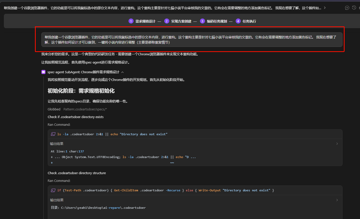 码道会根据已有的文档制定开发计划,然后一口气帮我们把工程开发完,这个时候我的目录下便得到了谷歌浏览器插件的产物。