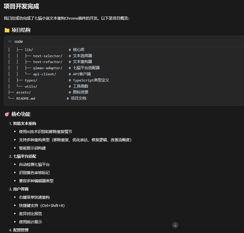 所以基于这个需求呢,我就使用码道开发了一款谷歌浏览器插件,这个浏览器插件呢,就可以检测我们七猫小说的这个文本,然后提供了众多的优化方案,如有这个检查冗于扩写错别字、剧情等等等等。