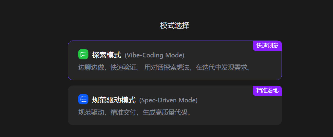 你可以选择探索模式和规范驱动模式或者直接开始开发。