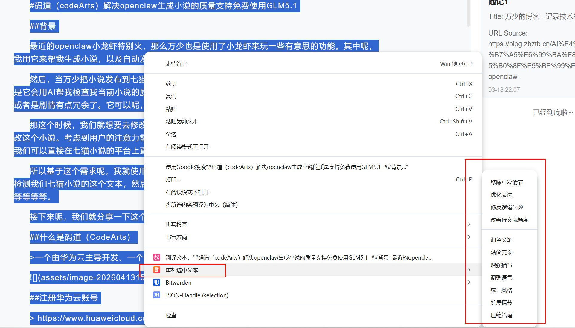 在网页上需要调整的小说部分,选中需要优化的文本,右键,然后可以自助的选择菜单,便可完成这个小说的优化了。