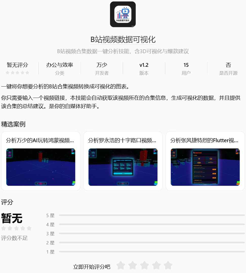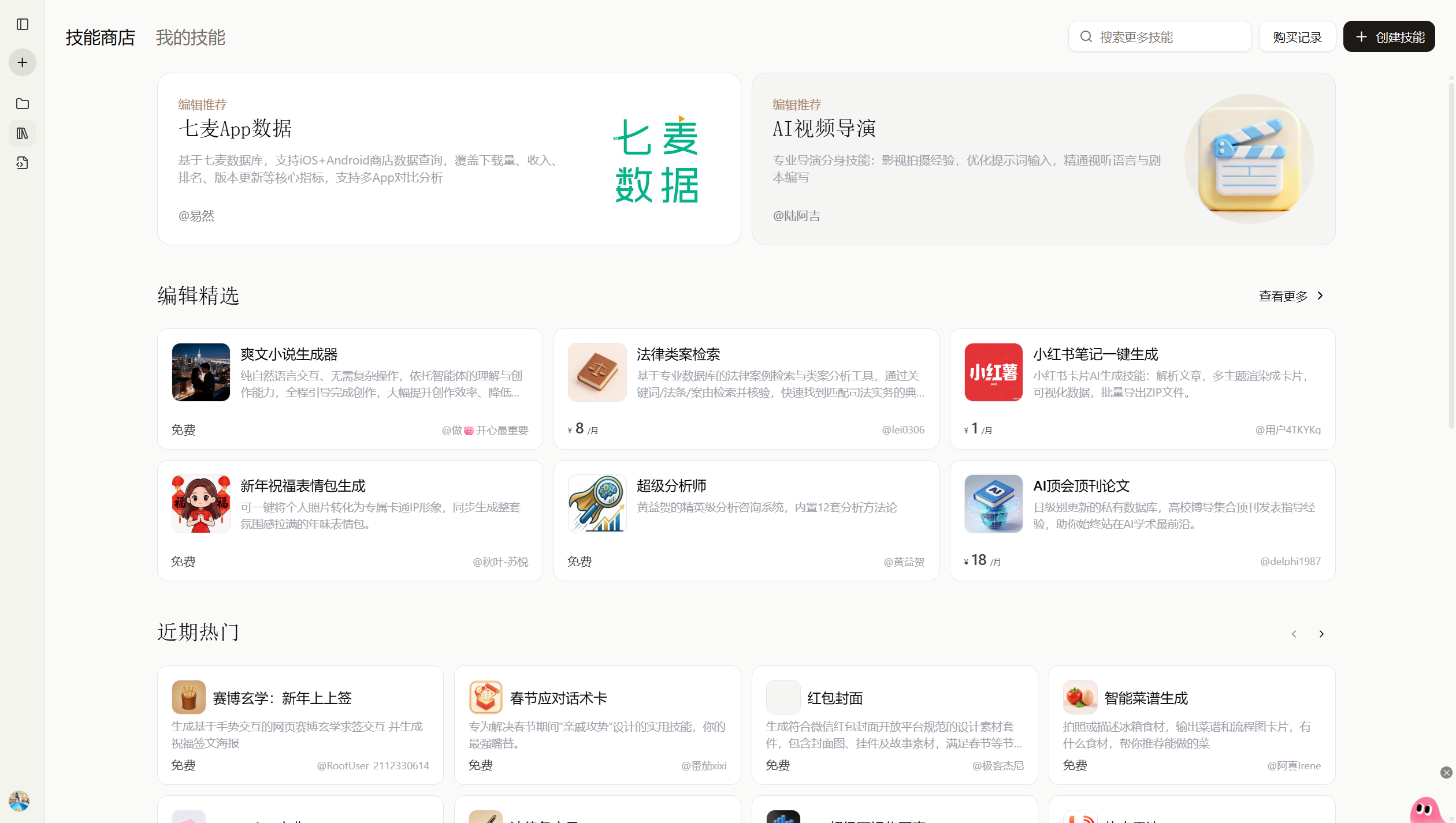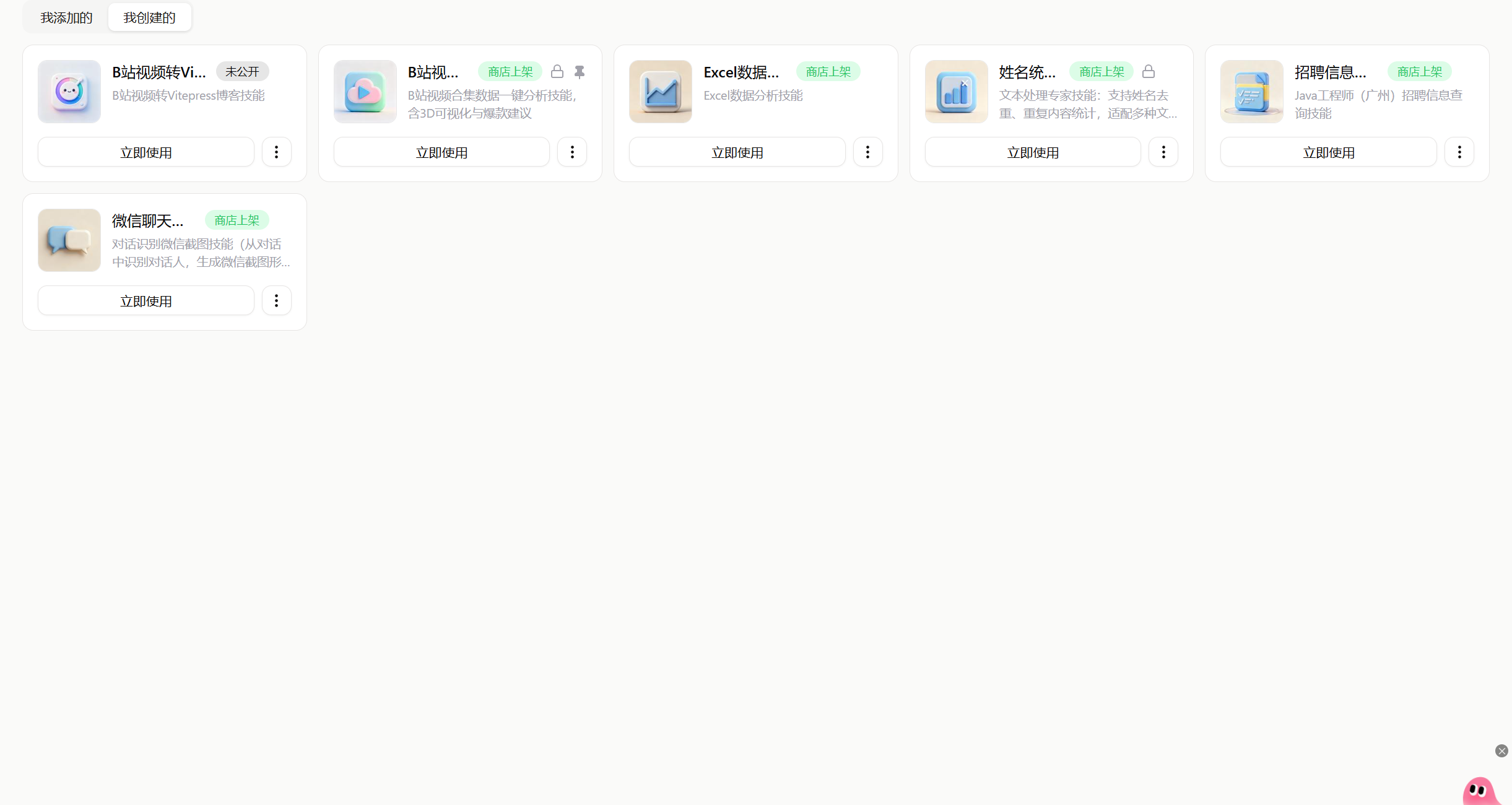 动手能力强的小伙伴也可以动手去操作一下,我也开发了几个技能,上架到技能商店上了。