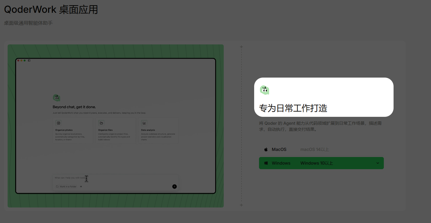 那 QoderWork 值得一试。目前它支持 macOS 14 以上和 Windows 10 以上系统,