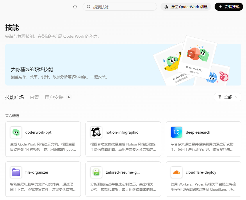 第二,支持自定义 Skills。 如果你有特定的工作流程或独特的业务需求,可以为 QoderWork 扩展专属技能,让它越用越懂你、越用