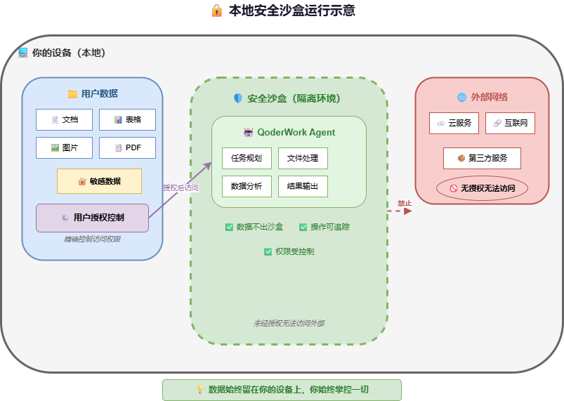 QoderWork 在这方面的策略非常清晰:所有操作都在本地沙盒中运