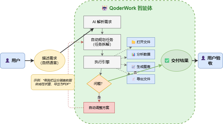 当你告诉 QoderWork"帮我把这份销售数据做成柱状图,导出为 PDF",它不会只给你一段操作指南,而是直接打开你的文件、分析数据、生成图表、导出文件——全程自主完成,你只需要验收结果。